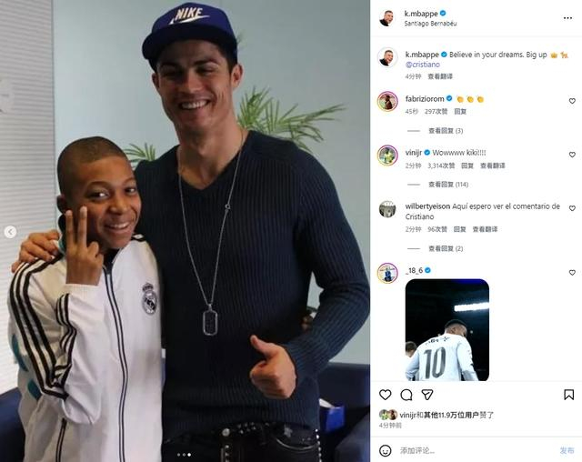 赛后,姆巴佩更新社媒,发布了本场比赛自己进球后模仿C罗庆祝的图片和自己少年时与C罗的合影,并配文道:“相信你的梦想。致敬王者。”