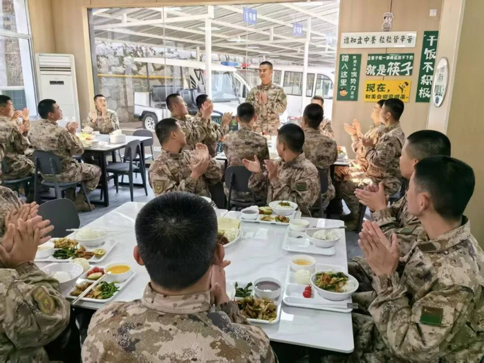 日常生活中,无论是炊事班精心准备的美味佳肴还是官兵们共同娱乐的文化活动,从竞技赛场到生日烛光,这些精心设计的场景,悄悄融化了新战友初来乍到的生涩,无声地将“我”融合为“我们”,铸就坚不可摧的战斗集体。