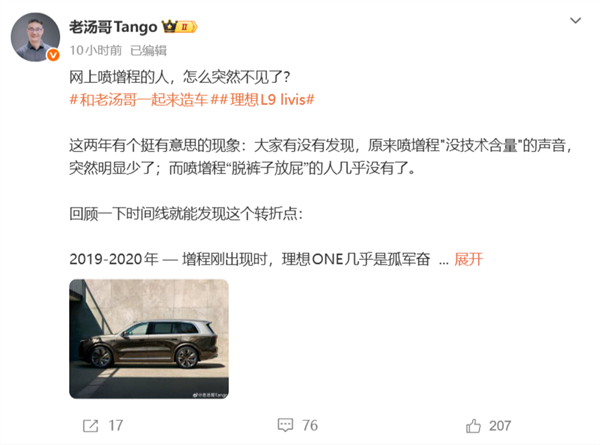 快科技3月10日消息,理想产品线负责人汤靖日前发文称,这两年有个挺有意思的现象:原来喷增程“没技术含量”的声音,突然明显少了;而喷增程“脱裤子放屁”的人几乎没有了。