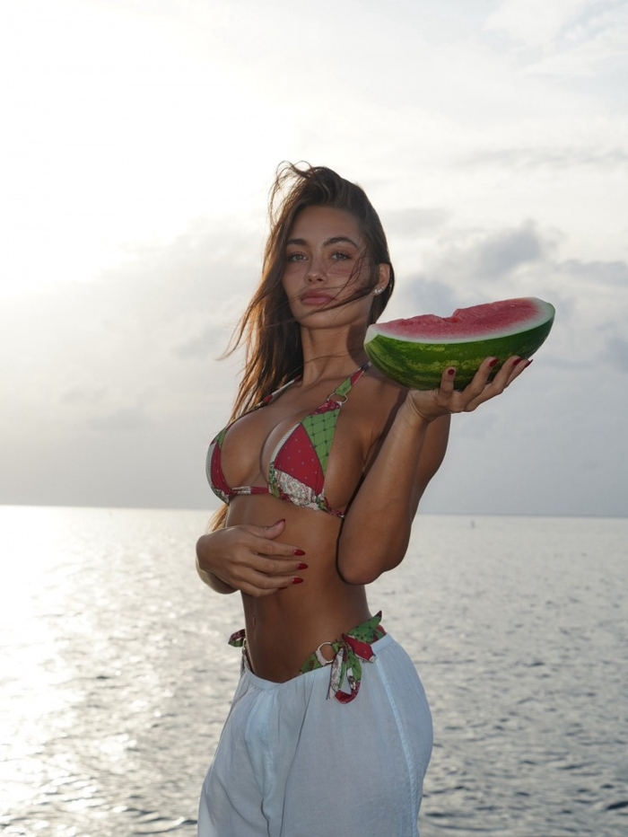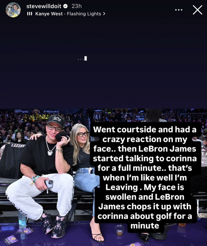有趣的是,SteveWillDoIt还提到与Corinna Kopf约会(下图),一起观战湖人比赛,结果自己过敏脸肿了了,然后詹姆斯一直和Corinna Kopf聊高尔夫。