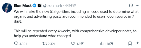 马斯克:X 平台将于七天内开源其算法